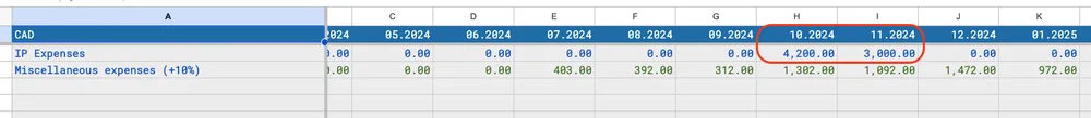 Вот тут я выделил расходы, которые требуется учесть в амортизации. В P&L есть строка, в которой необходимо рассчитать эту самую амортизацию. Сам процесс простой — мы знаем, как именно амортизируется данная статья, но в 10.2024 у нас есть сумма, и в амортизацию от нее попадает лишь небольшая часть, в моем примере это 0.42%, а значит и в 11.2024 тоже будет 0.42% от первой суммы, но в 11.2024 у нас есть траты, которые тоже необходимо амортизировать, и там появляется своя сумма, и далее идем по модели, где клиент в любой период может указать траты, которые нужно амортизировать.