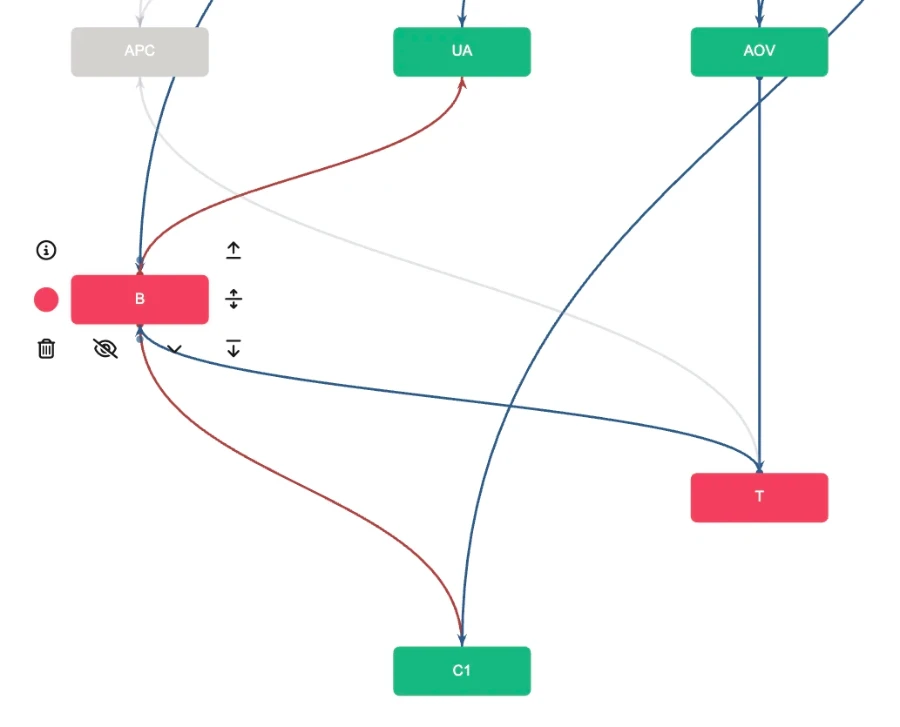When it comes to planning, however, when we answer the question of which metrics need to change in order to improve the target indicator, we can use neither this formula nor the values of metric B themselves. We simply cannot plan this metric.