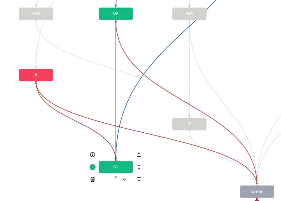 This gives us the following pattern of relations between metrics. The metric C1 depends on UA and B, which in turn are linked to event analytics.