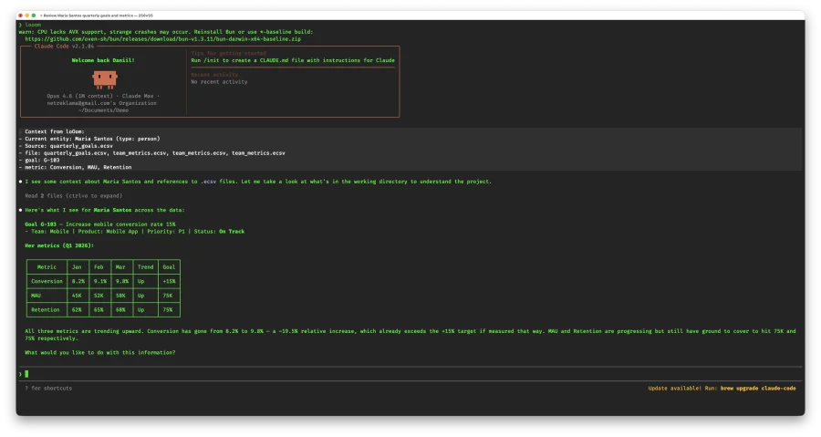 Используйте для анализа сущностей, создания конфигурации типов из данных, генерации отчётов, поиска аномалий. Нажмите ? → Setup Claude -- loOom создаст CLAUDE.md с инструкциями для агента.