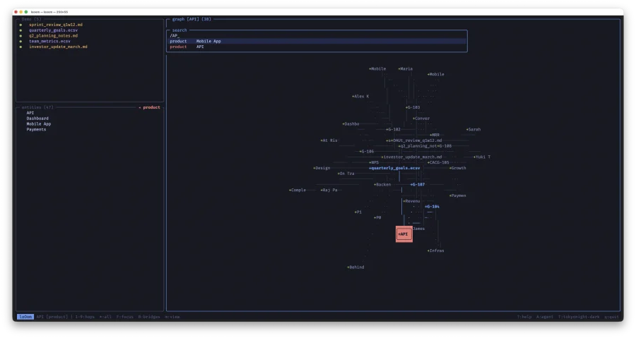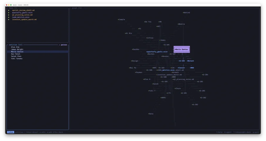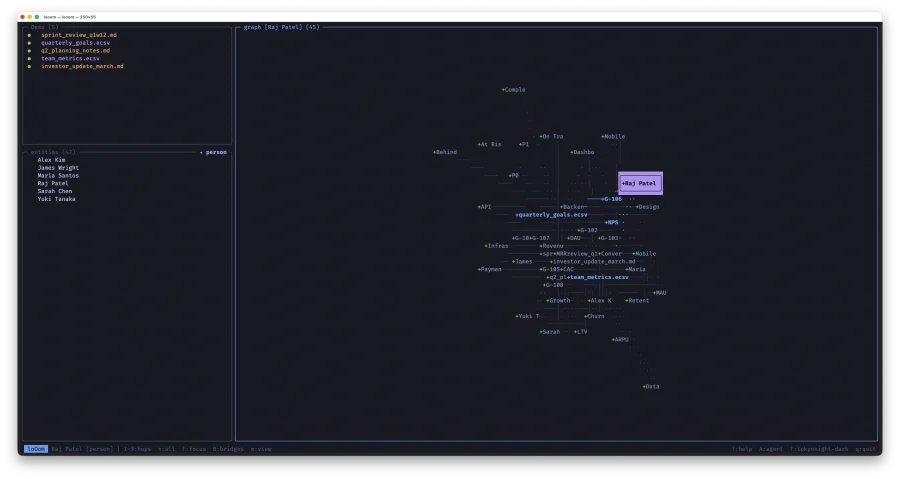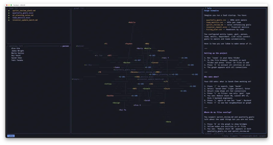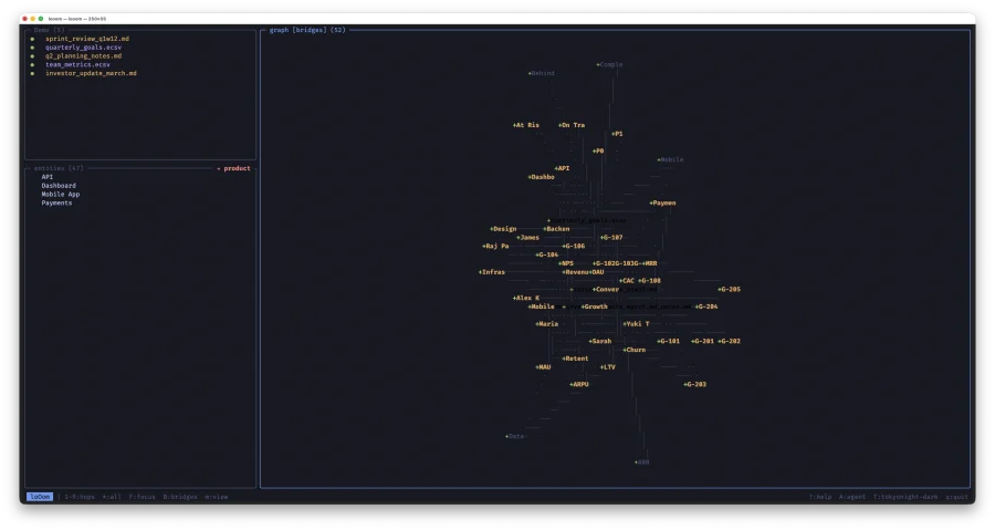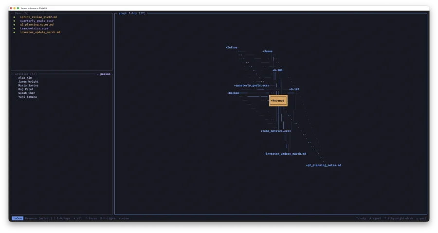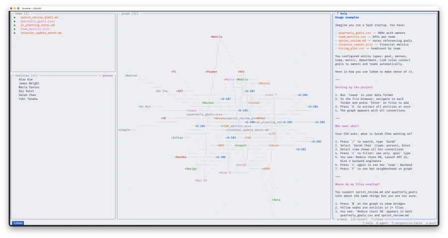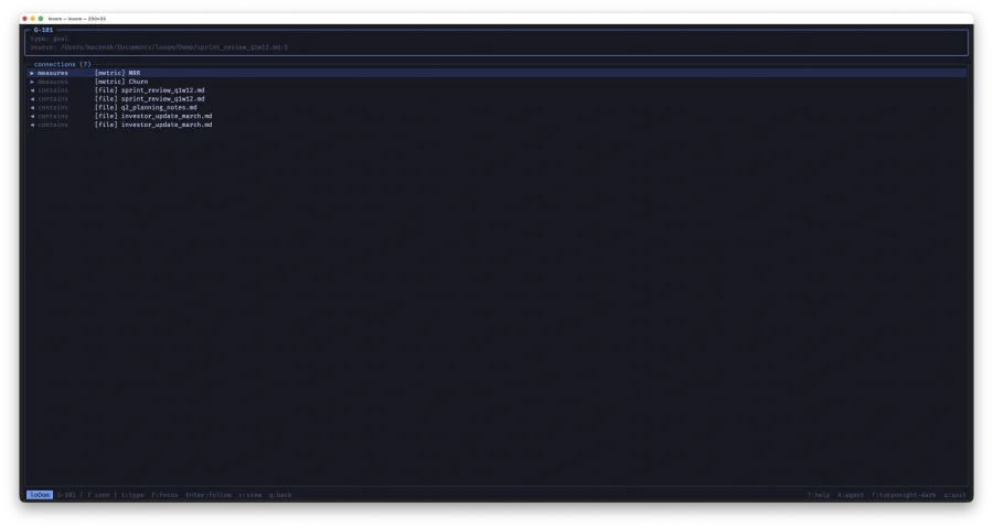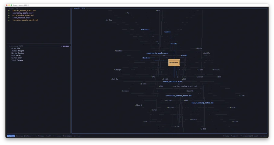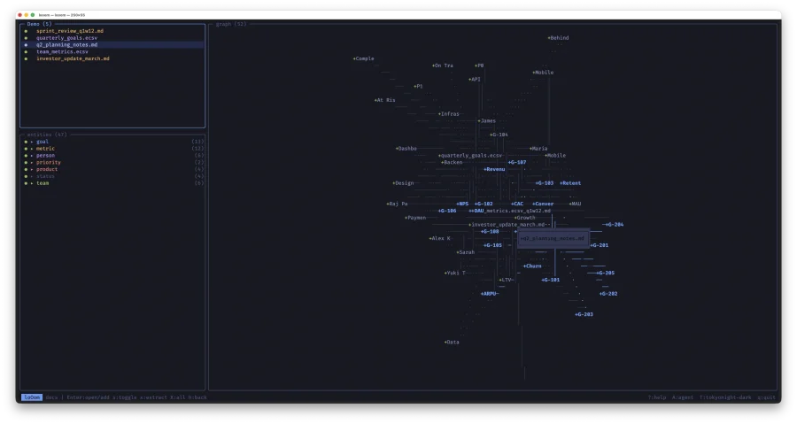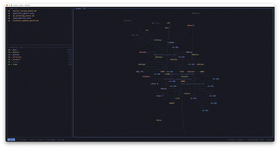 loOom -- TUI-приложение для построения графа знаний из ваших CSV, ECSV и Markdown файлов. Написано на C с ncurses: один бинарник, мгновенный запуск, работает без интернета. Данные не покидают вашу машину.