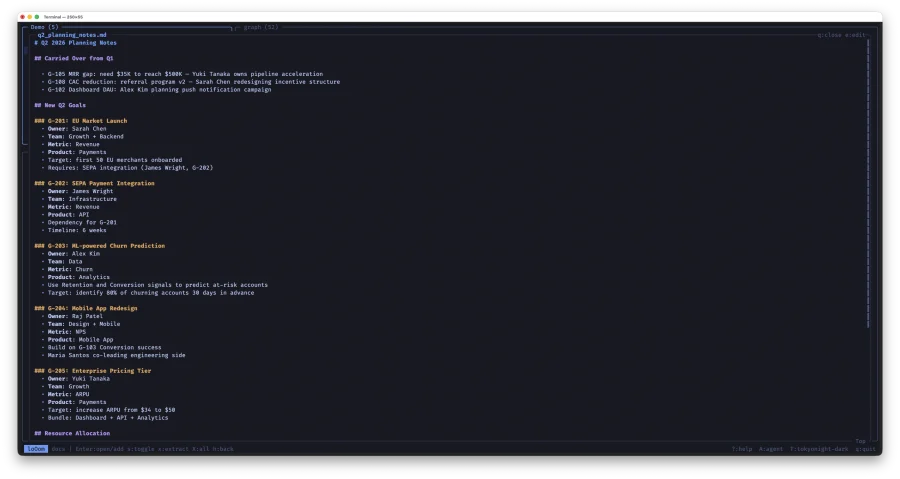t→ видим её цели (G-101, G-105, G-108) Enterна G-101 →t→ видим метрику Churn и продукт PaymentsEnterна Churn →t→ видим в каких файлах она упоминается